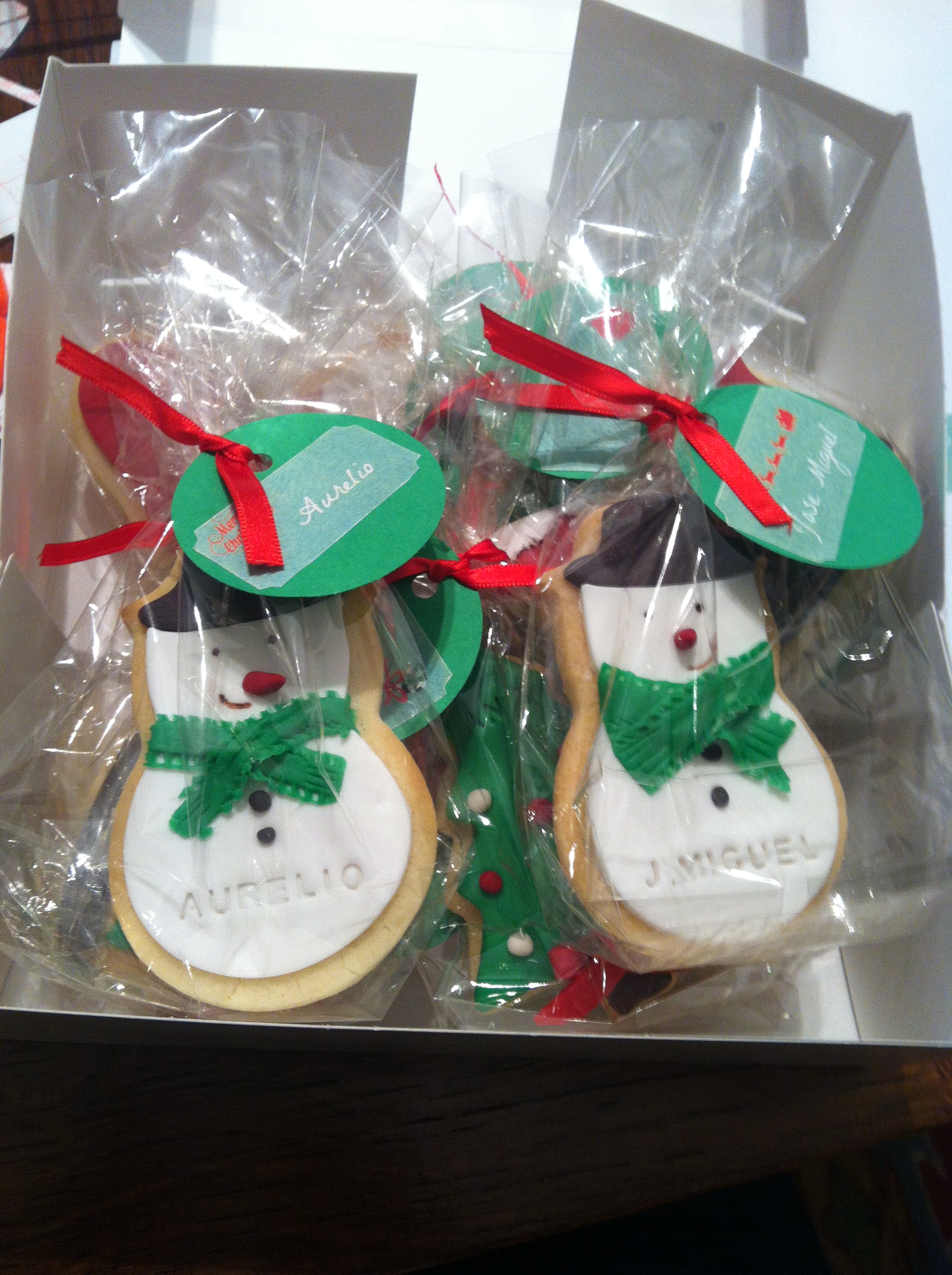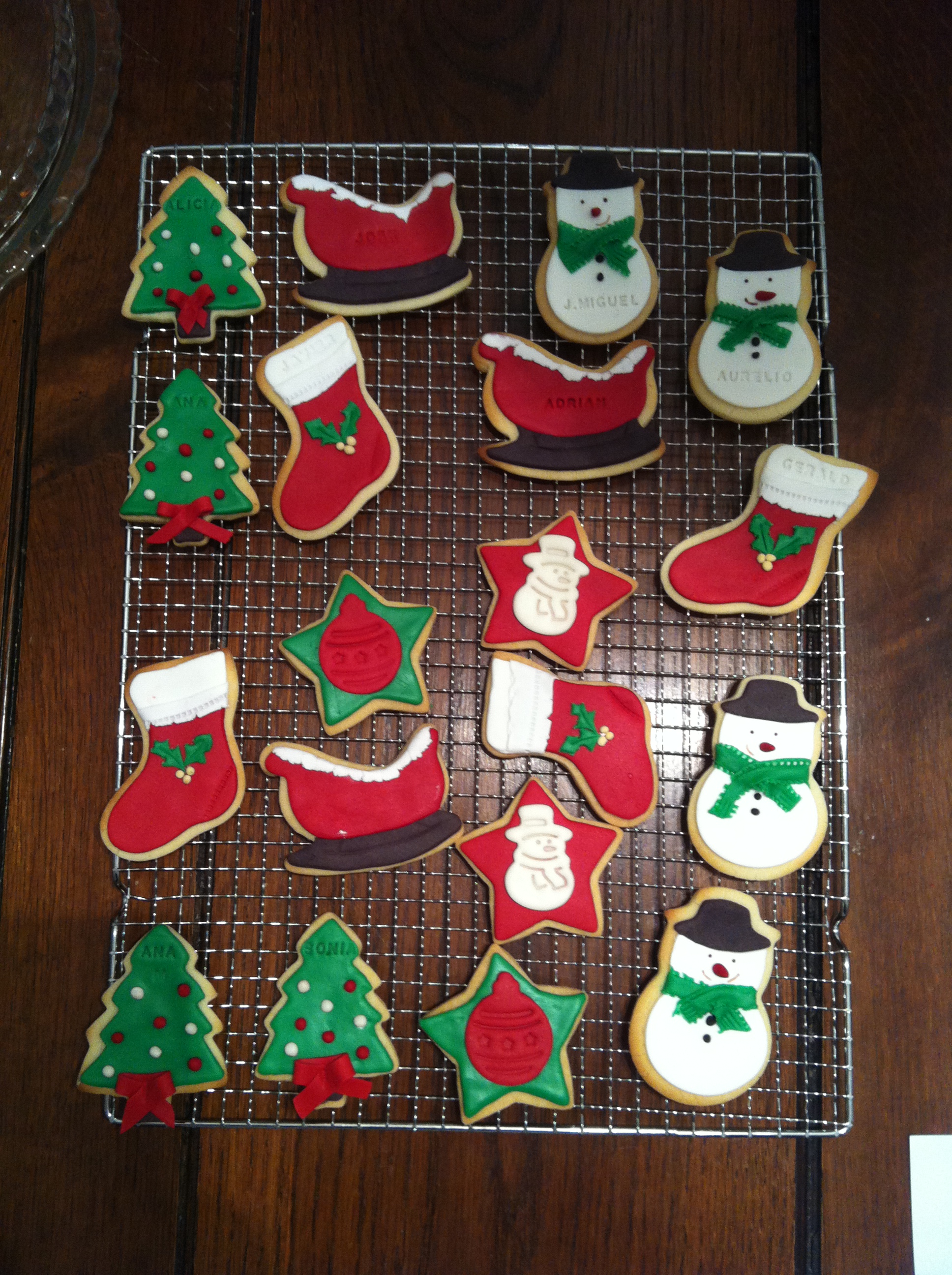 Como veis, hemos utilizado cortadores navideños de Wilton, el fondant verde está comprado en Taste of America, lo demás lo encontraréis en cualquier tienda de accesorios de decoración de galletas.