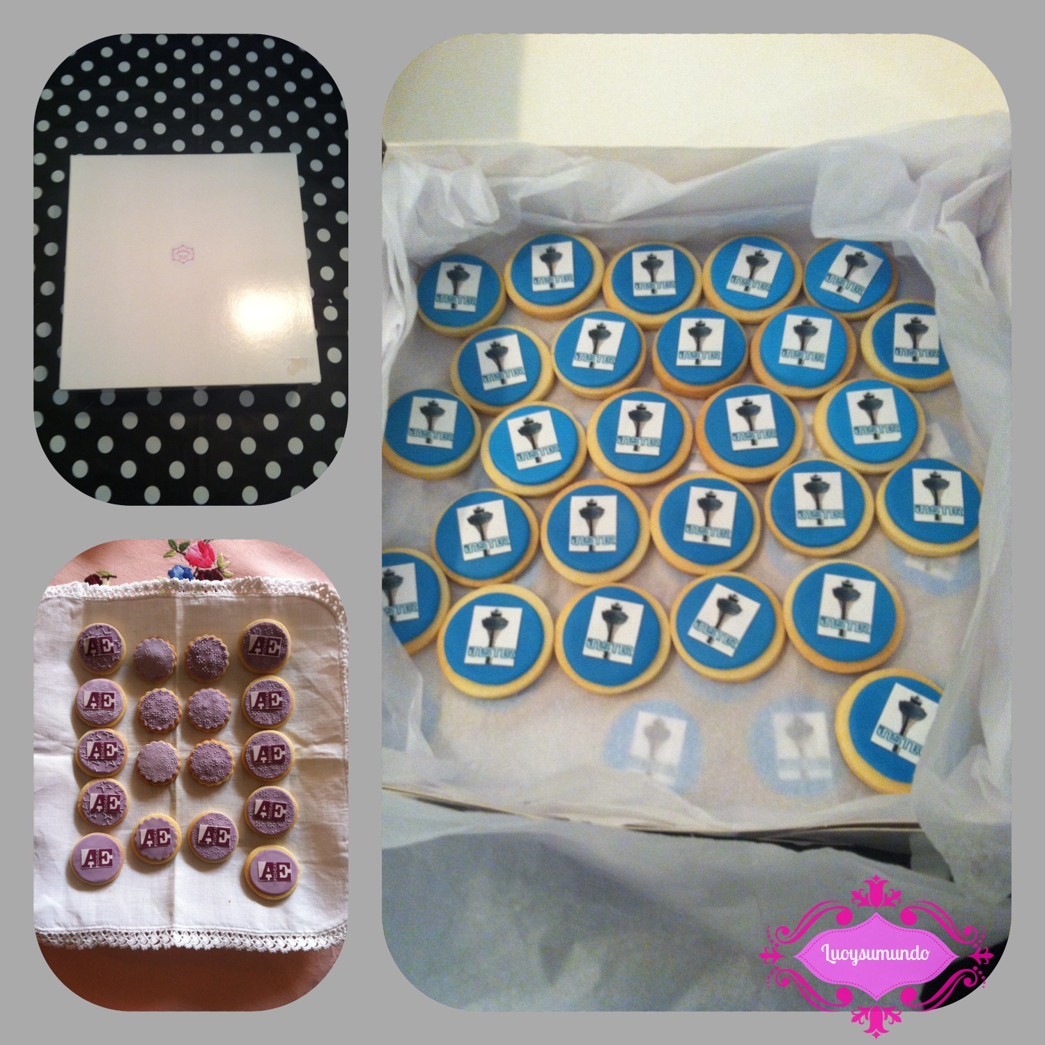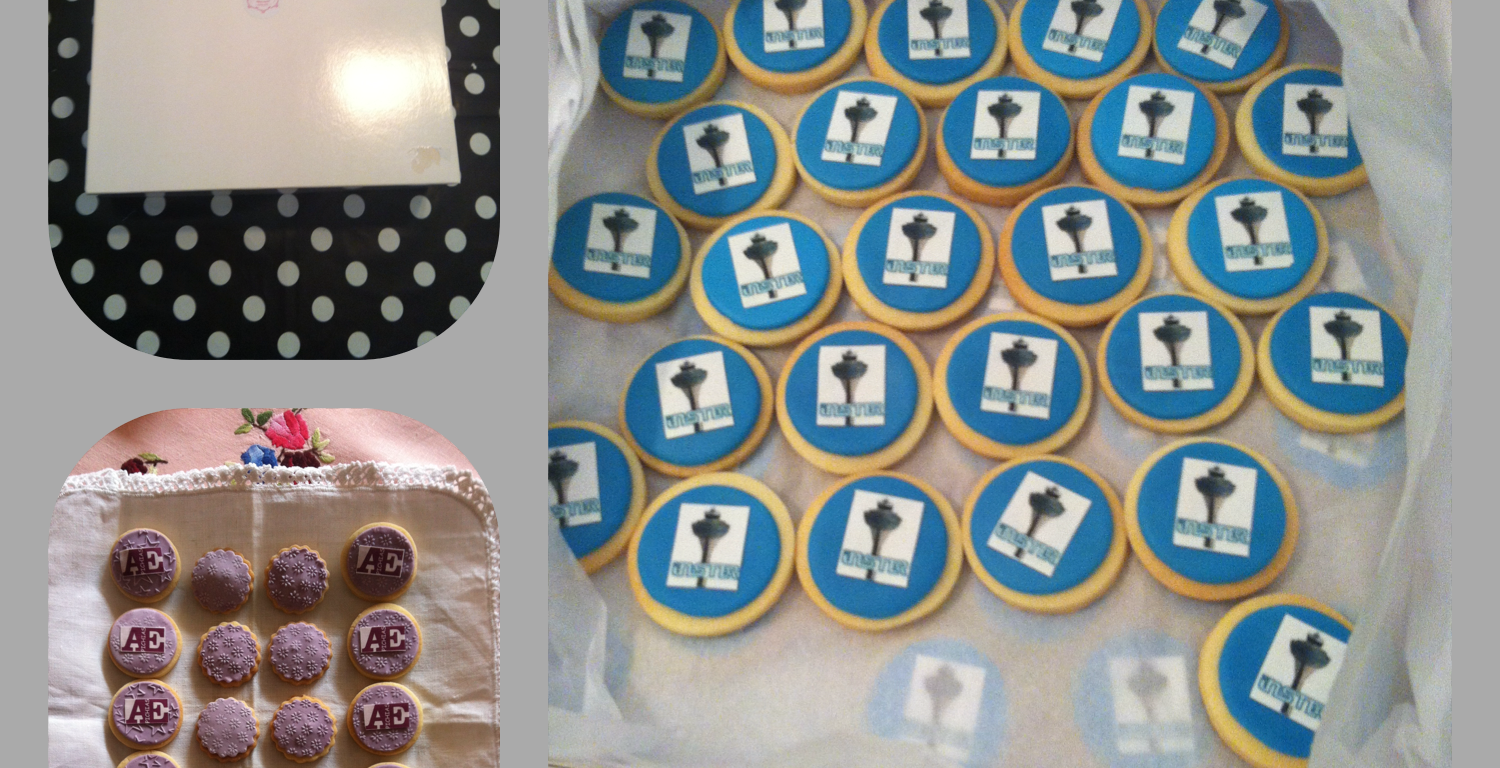 Esta vez, os enseño las últimas galletas que he hecho, con logos. Esta vez el tamaño era más pequeño, en formato pasta de té (unos 3.5cm de diámetro). Además, os enseño el packing que he utilizado para resolver el tema de las cantidades, finalmente una caja de transporte de 50 cupcakes. Y es que, entre ambas, se han hecho 150 unidades de galletas!!!