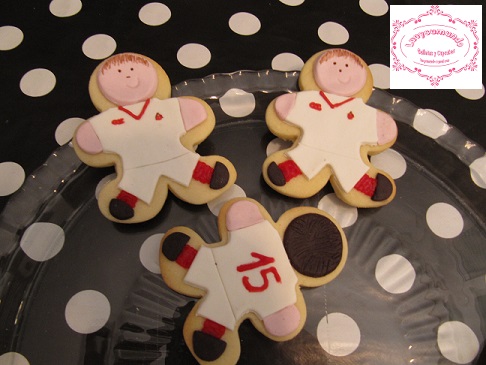 Los materiales utilizados esta vez, son fondant de base, y rotuladores de tinta comestible, los detalles son de glasa que da más juego. Las platillas del balón las hice sobre cartón de una caja de cereales, para luego recortar la masa y el fondant, el resto son moldes de corte normales.