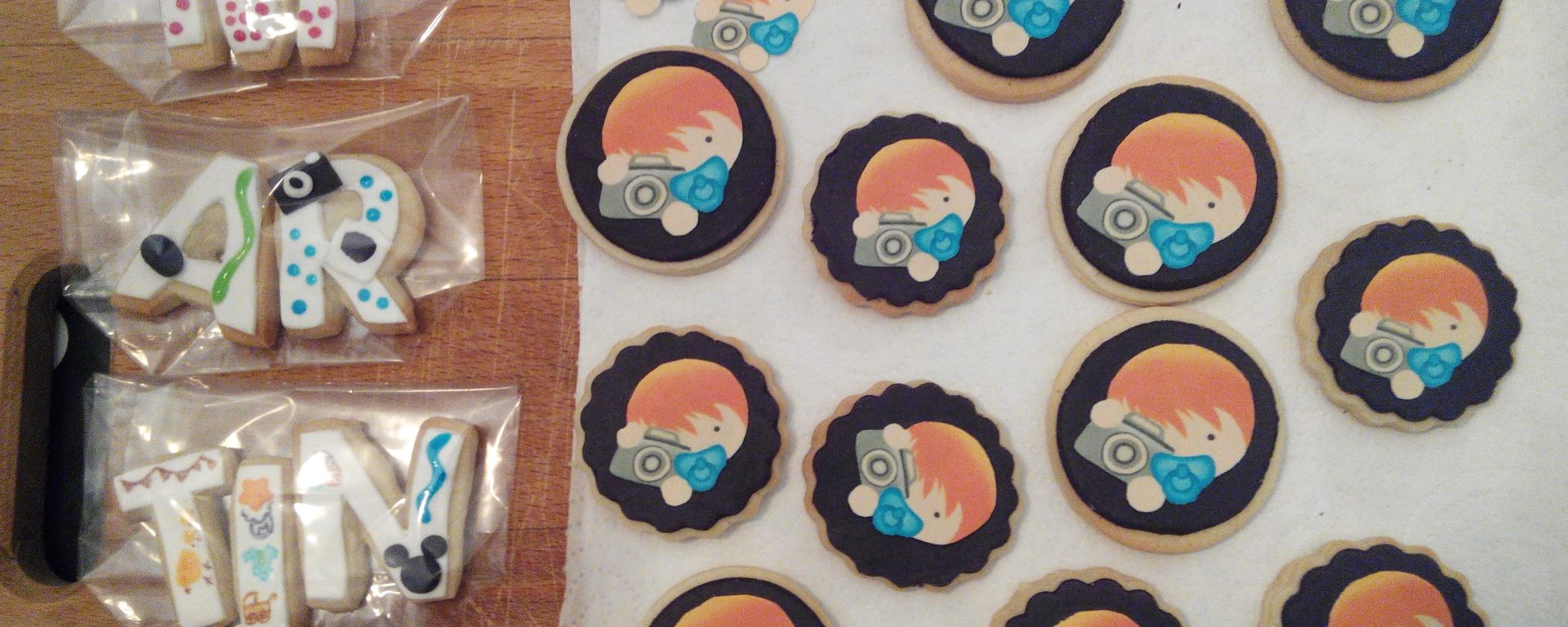 Las galletas, de mantequilla, de 2 cm . Recordar que cuando hablamos del tamaño de las galletas, realmente hablamos del molde con el que las cortamos, las galletas al hornear aumentan el tamaño. Los materiales utilizados para la decoración son Fondant, gel de decorar (este lo podéis encontrar en tubos), y papel de azúcar impreso.