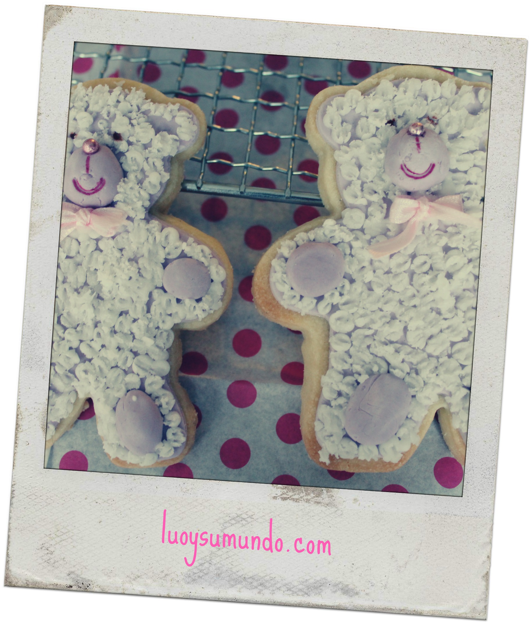Además, y ya que estaba innovando, por qué no poner en práctica una de las técnicas aprendidas durante el taller en Madrid de VIVA LA TARTA. Pero en vez de realizar la galleta entera de glasa, combiné la técnica del peluche, con una base de fondant para darle color moradito de fondo al osito. Y este ha sido el resultado.